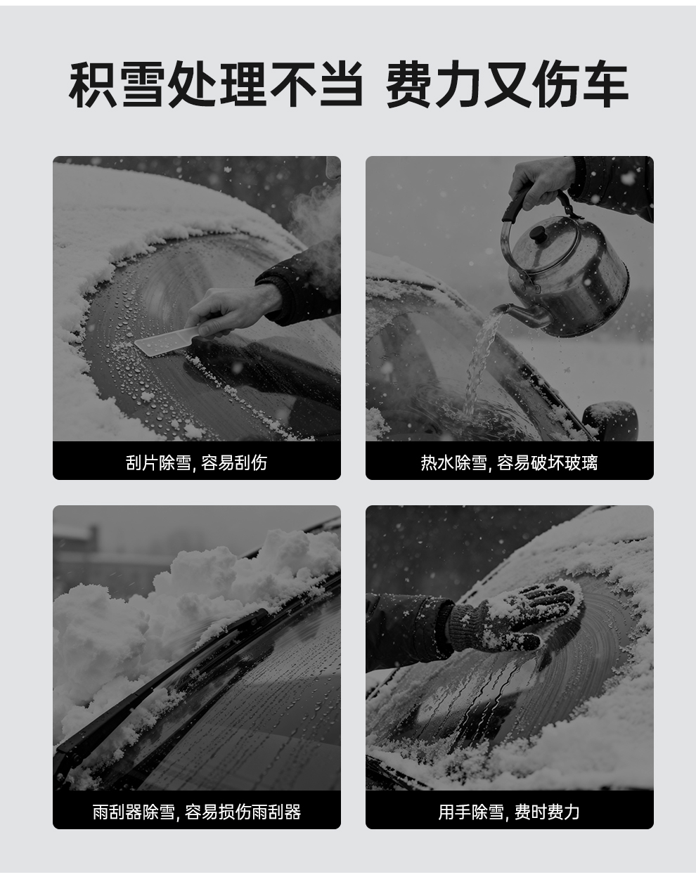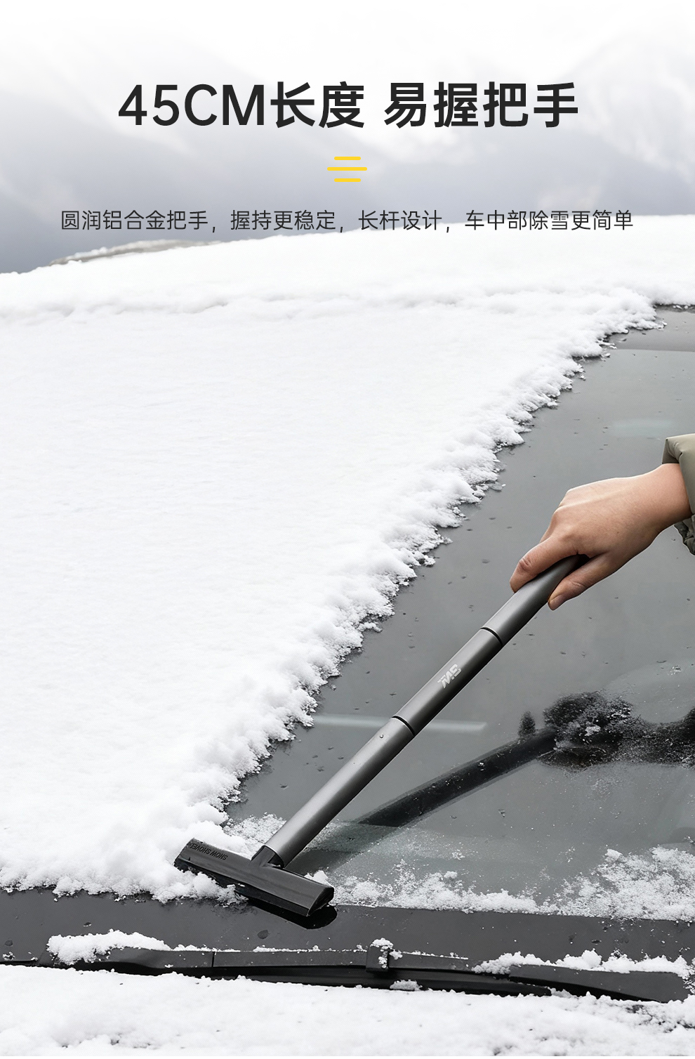 ヘッド部分には柔軟性に優れたTPU素材を採用。車のボディやガラスを傷つけることなく、しっかりと雪をかき取ることができます。ヘッドは表裏2面設計で、光沢面は除雪に、マット面は水切りにと、ワンタッチで使い分けが可能。幅広12cmのワイドヘッドにより、一度の動作で広範囲の雪を効率よく除去でき、作業時間を大幅に短縮します。